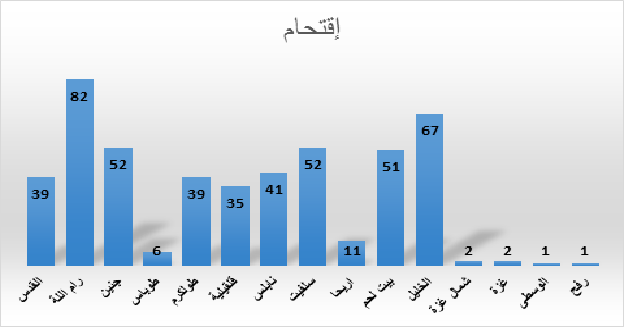 من بينها: 58 خلال عمليات الإقتحام، 84 من قبل حواجز عسكرية، 37 من قبل زوارق حربية، 164 من قبل مواقع عسكرية، 110 بقصف جوي. |