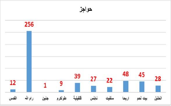 تم نصب 487 حالة نصب لحواجز عسكرية مفاجئة على مداخل القرى ومشارف البلدات والمخيمات في الضفة لتفتيش السيارات والتدقيق بهويات المواطنين تركزت بمجملها على التوالي بمحافظات رام الله، أريحا، بيت لحم، قلقيلية. |