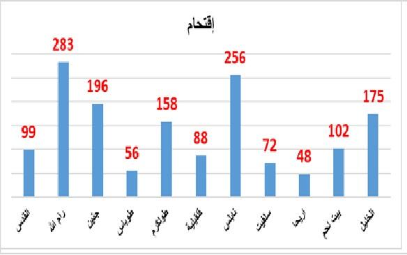 تم خلال هذا الشهر تسجيل 1533 عملية اقتحام للقرى، البلدات والمخيمات الفلسطينية بمحافظات الضفة تركزت مجملها على التوالي بمحافظات: رام الله، نابلس، جنين، الخليل، طولكرم، بيت لحم والقدس. |