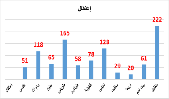 اعتقال 995 مواطناً كان من بينهم 20 طفل ، 6مواطنات ، 3 من بين المسنين، طالب جامعي و6 من بين العسكريين وتركزت عمليات الاعتقال بمجملها على التوالي بمحافظات الخليل، طوباس، نابلس، رام الله، قلقيلية، بيت لحم، طولكرم |