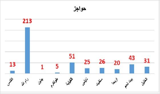428 حالة نصب لحواجز عسكرية مفاجئة على مداخل القرى ومشارف البلدات والمخيمات في الضفة لتفتيش السيارات والتدقيق بهويات المواطنين تركزت بمجملها على التوالي بمحافظات رام الله، قلقيلية، بيت لحم، الخليل |