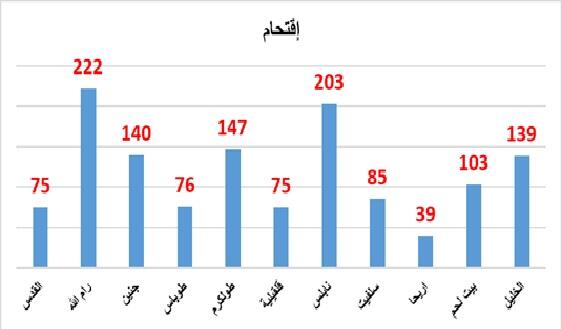 تم خلال هذا الشهر تسجيل 1304 عملية اقتحام للقرى، البلدات والمخيمات الفلسطينية بمحافظات الضفة تركزت مجملها على التوالي بمحافظات: رام الله، نابلس، طولكرم، جنين، الخليل، بيت لحم، سلفيت والقدس |