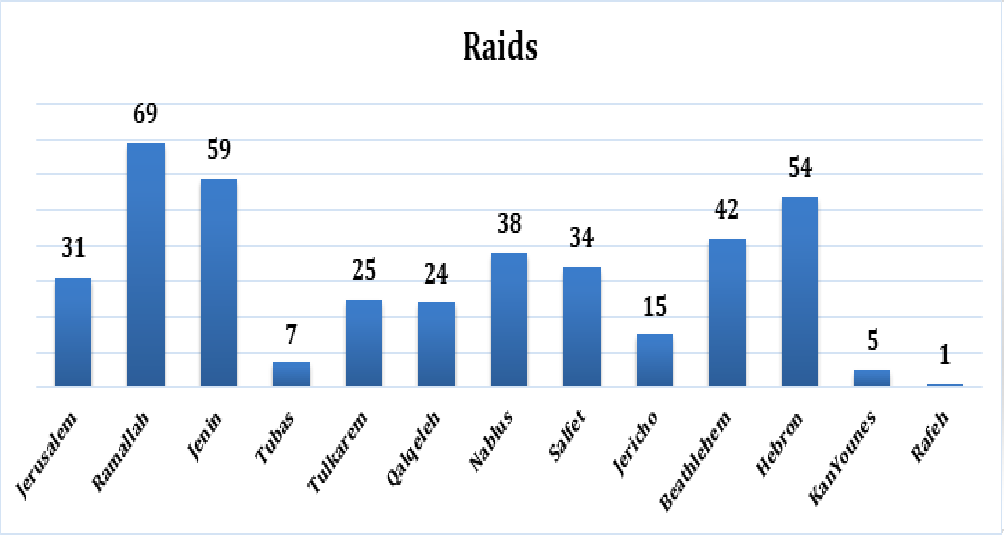 The Israeli military carried out a total of 438 raids in Palestinian residential areas during the month of January 2022, including 434 in the West Bank and 4 in the Gaza Strip. The majority of Israeli military raids were reported to have taken place in the districts of Jerusalem (28); Ramallah (66); Jenin (53); Tubas (3)Tulkarem (43); Qalqiliya (23); Nablus (74); Salfit (23); Jericho (14); Bethlehem (57); Hebron (51), North Gaza (2), Khan Yunis (1) and Rafah (1). |