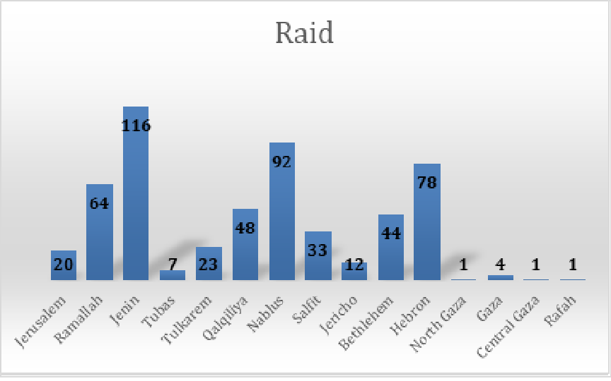 The Israeli military carried out a total of 544 raids in Palestinian residential areas during the month of December 2022, including 537 in the West Bank and 7 in the Gaza Strip. The majority of Israeli military raids were reported to have taken place in the districts of Jerusalem (20); Ramallah (64); Jenin (116); Tubas (7), Tulkarem (23); Qalqiliya (48); Nablus (92); Salfit (33); Jericho (12); Bethlehem (44); Hebron (78), North Gaza (1) , Gaza (4) Central Gaza (1) and Rafah (1). |