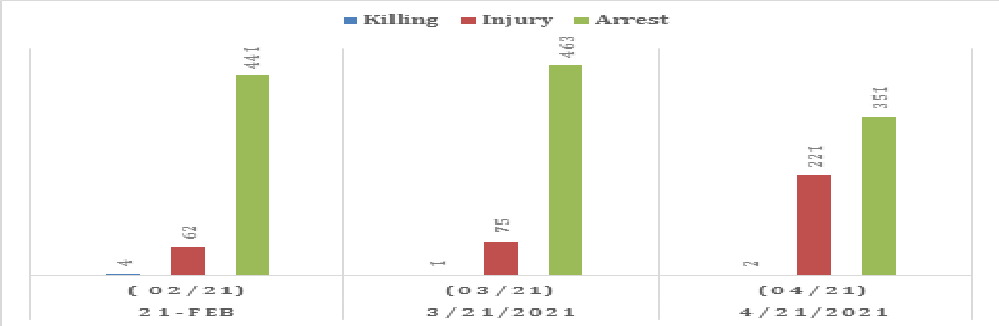 A total of 221 injuries were reported in the month of April 2021 {213 Palestinians in the West Bank and 8 in the Gaza Strip). Including 5 children, 2 Women, 1 elderly citizen, 1 Special needs patient and 1 Security Force Officer. |