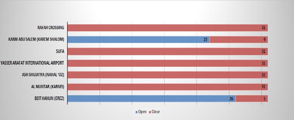 The Israeli military closed international crossing points on 62 occasions. Rafah Crossing was closed. Yasser Arafat International Airport has remained closed since the outbreak of the second Intifada.